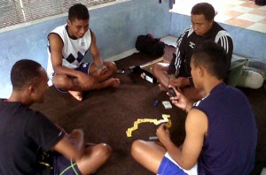 TRIBUNJOGJA.COM, YOGYA – Dua pemain PSIM, Engkus Kuswaha dan Steven Imbiry, serta asisten pelatih PSIM, Fatchurrohman, asyik bermain gaple di mess tim sepak bola tersebut, di dekat Stadion Mandala Krida, Yogyakarta, Selasa (25/1/2011) pagi. Mereka duduk beralaskan karpet ditemani iringan musik yang mengalun dari dalam kamar tidur.