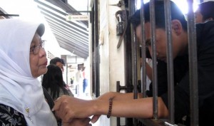 Arief Johar CP bercengkerama dengan ibundanya dari balik sel tahanan sementara PN Sleman, Yogyakarta, Senin (7/2/2011).