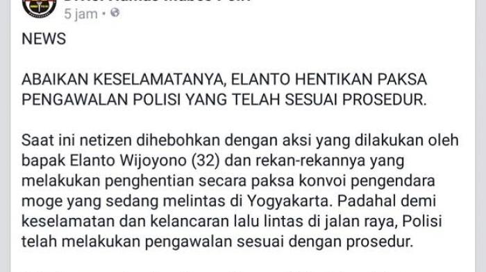 Postingan itu berjudul "ABAIKAN KESELAMATANNYA, ELANTO HENTIKAN PAKSA PENGAWALAN POLISI YANG TELAH SESUAI PROSEDUR".