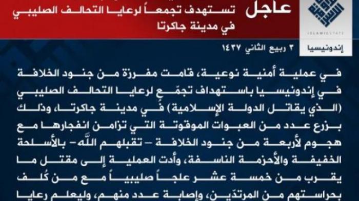 "Sekelompok militan khilafah di Indonesia telah menargetkan sekumpulan aliansi kafir yang melawan ISIS di Jakarta,