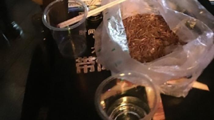 Dalam plastik itu terdapat sejumlah ulat, sumpit, gelas, dan beberapa botol minuman keras khas Tiongkok, baijiu.