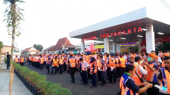 Ratusan petugas KAI DAOP 6 berkumpul di depan halaman selatan Stasiun Tugu Jogja untuk menertibkan Pedagang Kaki Lima