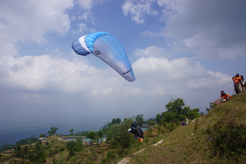 Sebanyak 30 atlet dari berbagai daerah di Indonesia menerbangkan paralayang dari atas Embung Batara Sriten, puncak tertinggi Kabupaten Gunungkidul. Puluhan pasang mata menjadi saksi para atlet saling adu kebolehan dan kepiawaiannya dalam menerbangkan wahana dirgantara tersebut.