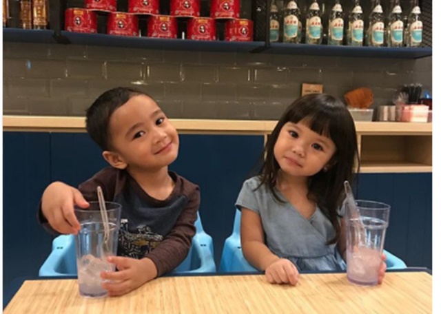 Dalam foto tersebut kedua bocah itu kompak tersenyum menghadap kamera dengan segelas minuman yang sama.
