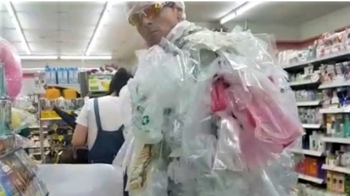 TRIBUNJOGJA.COM - Tepat di hari perayaan Hari Bumi, manusia monster kantong plastik berkeliling mengahntui kota Bangkok, Minggu (22/4/2018).