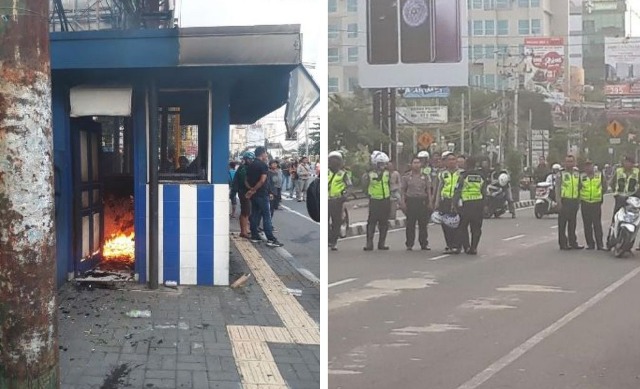 Polisi bersiaga krn terjadi pembakaran Pos Polisi," tulisnya.