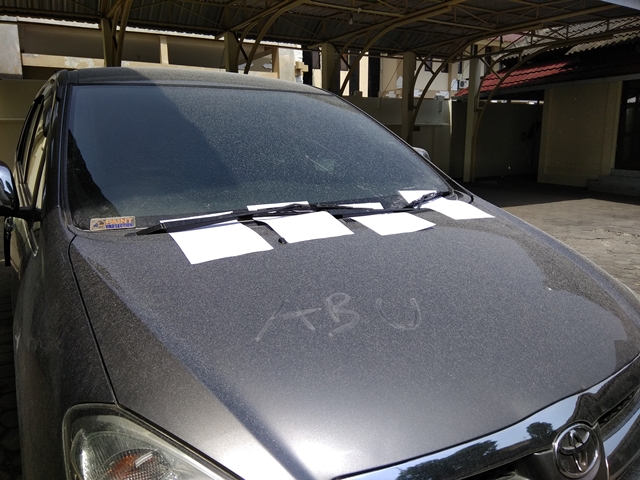 Abu tampak menutupi mobil yang terparkir di kantor BPPTKG Yogyakarta, Jumat (11/5/2018)