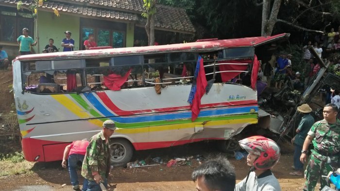 TRIBUNJOGJA.COM - Bus yang ditumpangi rombongan pengantin mengalami kecelakaan di tanjakan atau turunan Cae, Dusun Cilangkap, Desa Sukajadi, Kecamatan Wado, Sumedang, Sabtu(23/6/2018).