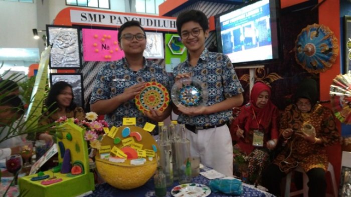 Dua siswa SMP Pangudi Luhur tampak sibuk melayani pengunjung Gelar Karya Kursus dan Pelatihan Job Fair 2018 yang mendatangi stan mereka.