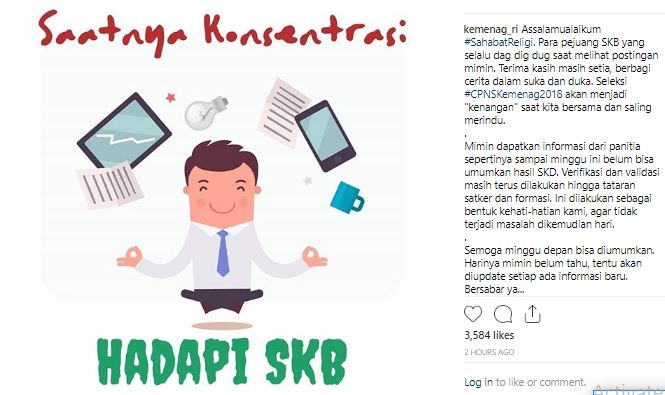 Jadwal pengumuman hasil SKD CPNS Kemenag dan lokasi ujian SKB CPNS Kemenag yang rencananya dilaksanakan di satker dan kanwil tersebut diinformasikan Kemenag RI melalui akun instagramnya.