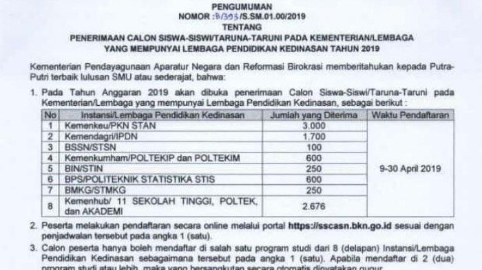 Dalam pengumuman bernomor B/393/S.SM.01.00/2019 itu disebutkan, pendaftaran calon siswa-siswi atau taruna-taruni di sekolah kedinasan akan dilaksanakan pada 9-30 April 2019.