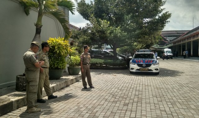 Begitu mobil rombongan masuk parkiran di sekitar bangsal Kepatihan, sejumlah petugas langsung menyeterilkan lokasi.