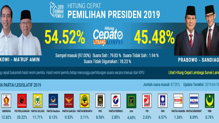 UDPATE TERBARU Hasil Quick Count Jokowi vs Prabowo Litbang Kompas menunjukan angka Jokowi-Makruf (54.52) - (45.48) Prabowo-Sandi