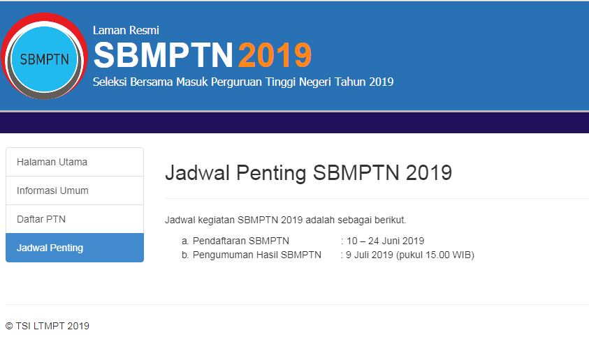 2. Pengumuman Hasil SBMPTN : 9 Juli 2019 (pukul 15.00 WIB)