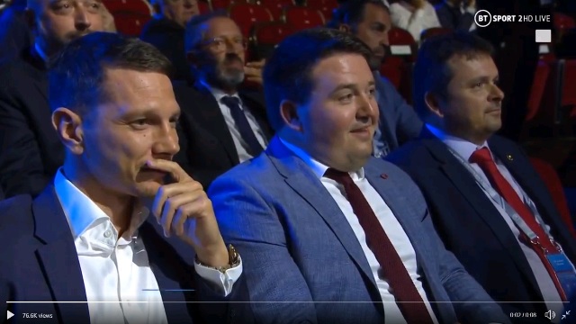 Terutama momen ketika kamera menyorot pejabat klub asal Ceko itu.