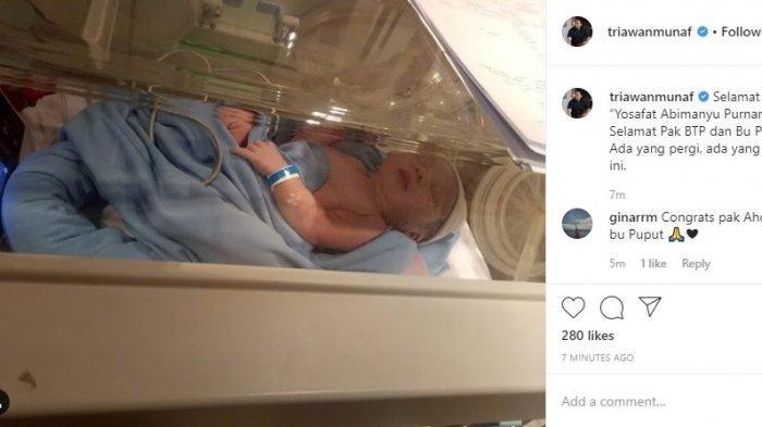 "Selamat atas lahirnya “Yosafat Abimanyu Purnama” (emoticon bayi laki-laki) Selamat Pak BTP dan Bu Puput.
