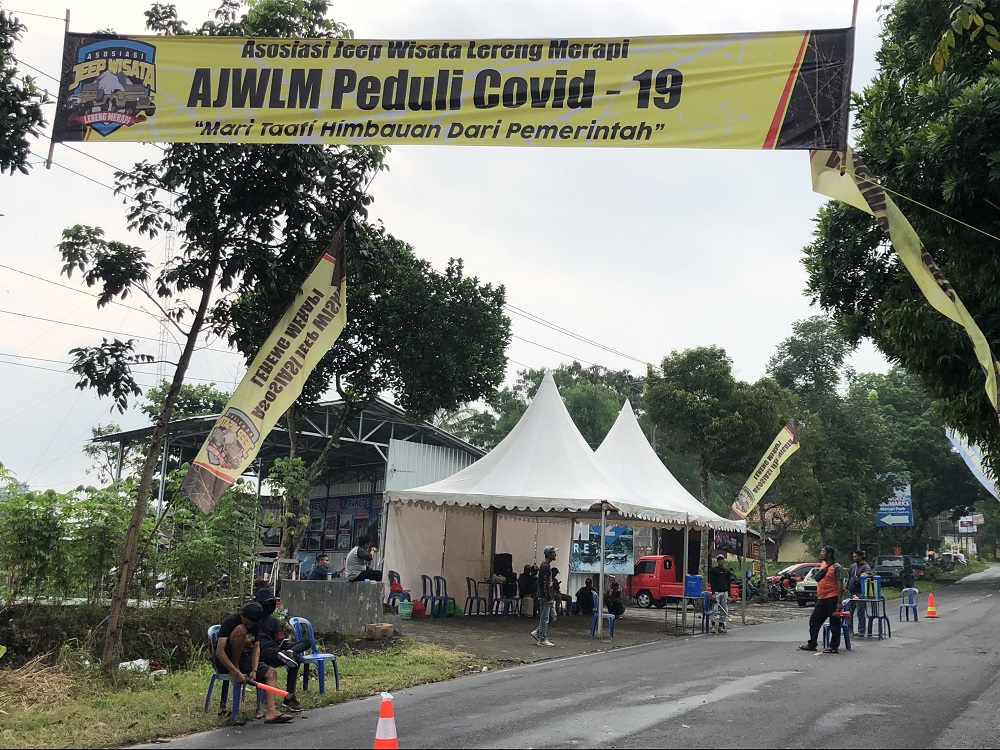 Tidak mau tinggal diam menghadapi virus Corona, AJWLM melakukan penyemprotan disinfektan bagi kendaraan yang menuju kawasan sekitar lereng Merapi.