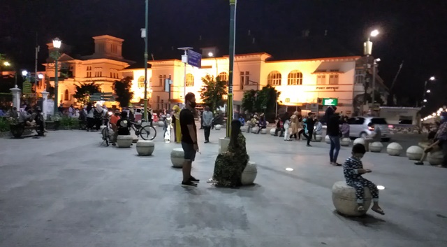 Terlihat pada pukul 19.00 WIB malam ini, para pengunjung tampak menempati kursi-kursi di sekitar Titik Nol Kilometer untuk sekadar menikmati malam.