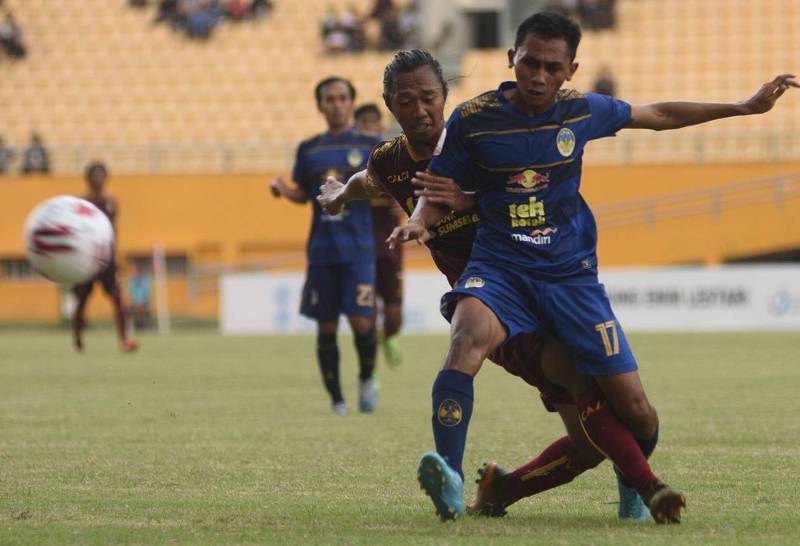 Winger PSIM Yogyakarta, Nanda Nurrandi berduel dengan pemain Sriwijaya FC pada laga perdana Liga 2 2020, Maret 2020 lalu.