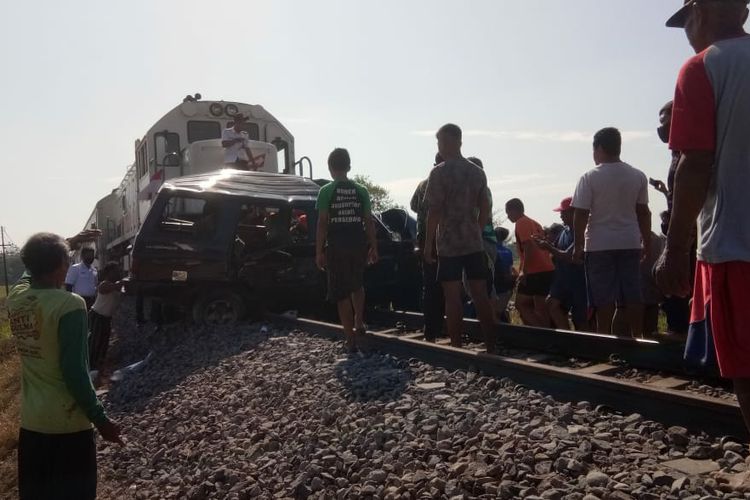 TRIBUNJOGJA.COM, KEDIRI - Sebuah minibus tertabrak kereta api Rapih Dhoho jurusan Surabaya Blitar di perlintasan tanpa palang pintu di Desa Baye, Kecamatan Kayen Kidul, Kabupaten Kediri, Jawa Timur, Senin (17/8/2020).