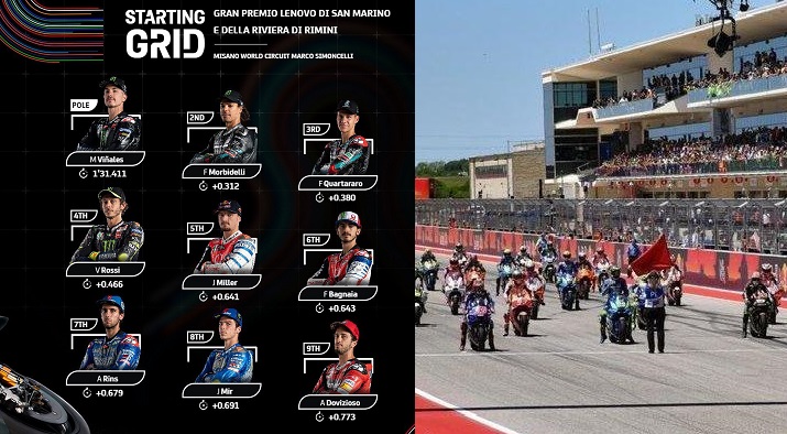 Empat baris terdepan starting grid balapan MotoGP San Marino yang akan digelar Minggu (13/9/2020) petang ini, secara berurutan dikuasai Maverick Vinales, Franco Morbidelli, Franco Morbidelli, dan Valentino Rossi.