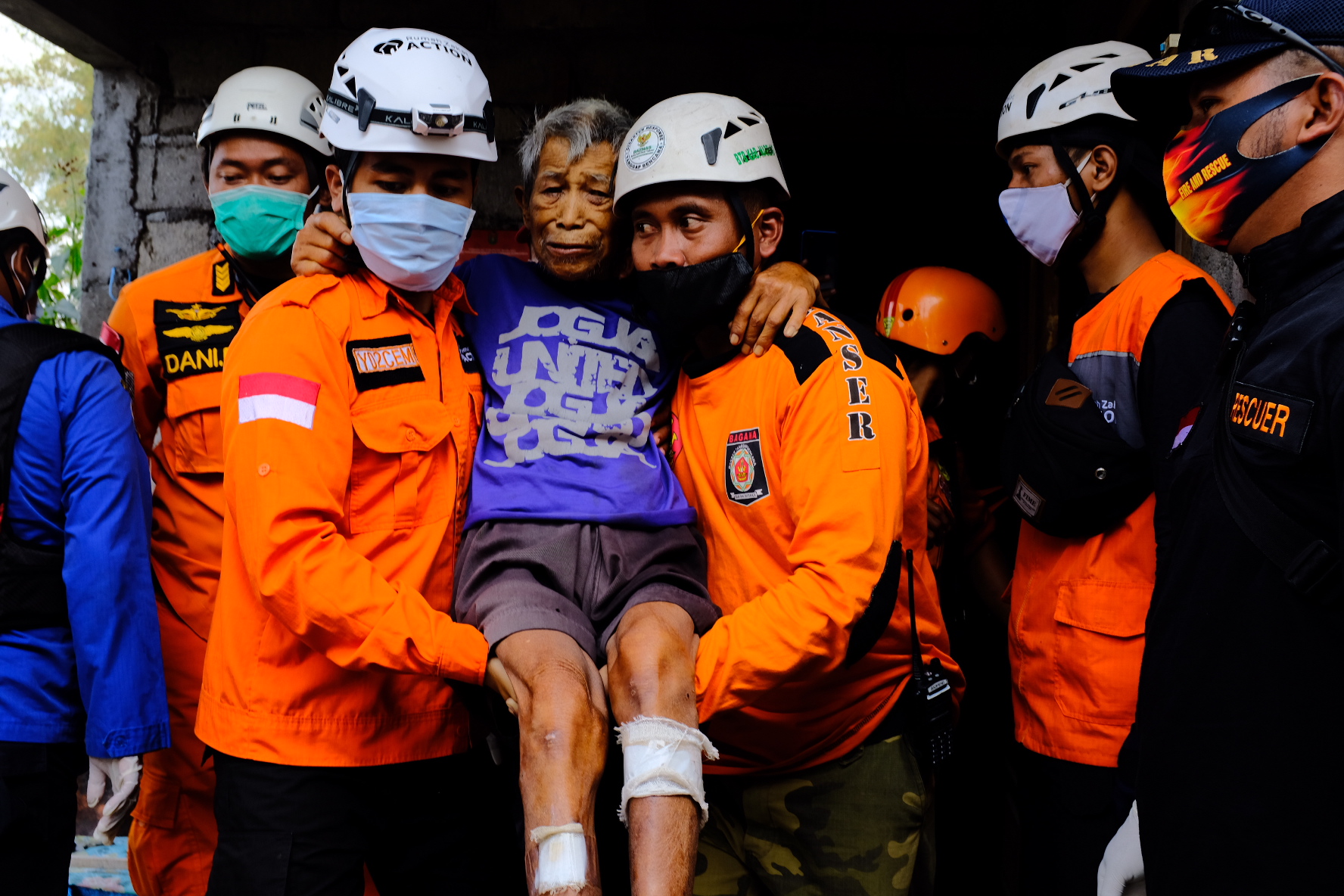 Orang yang berusia lanjut yang dievakuasi dengan bantuan petugas.
