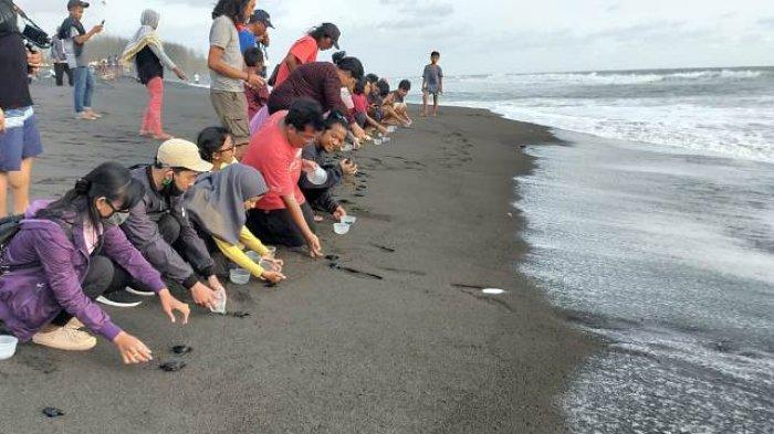TRIBUNJOGJA.COM, KULON PROGO - Puluhan tukik jenis lekam dilepasliarkan di pesisir Pantai Trisik di Kapanewon Galur, Kabupaten Kulon Progo.