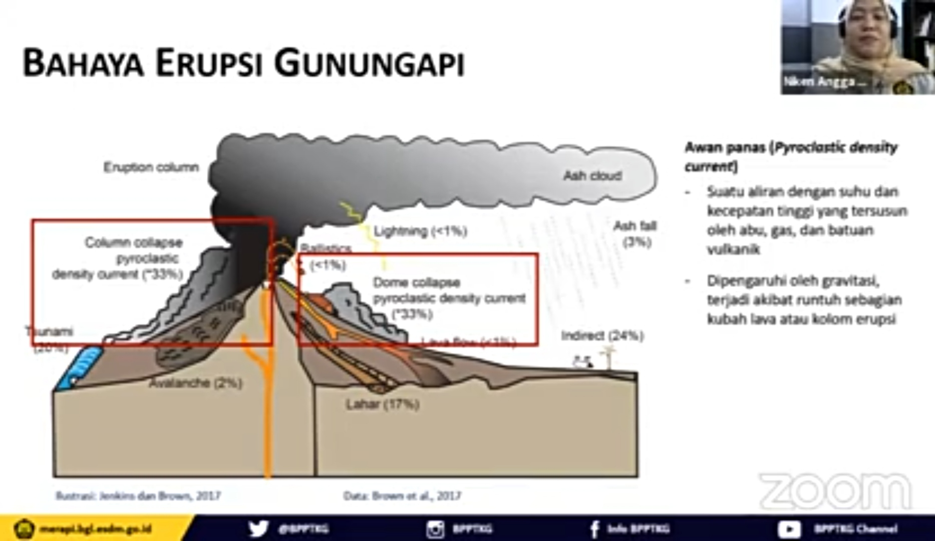 Lebih lanjut, Niken menjelaskan tentang tiga ancaman bahaya langsung gunung api yang paling banyak terjadi, yaitu awan panas, lahar, dan jatuhan abu.