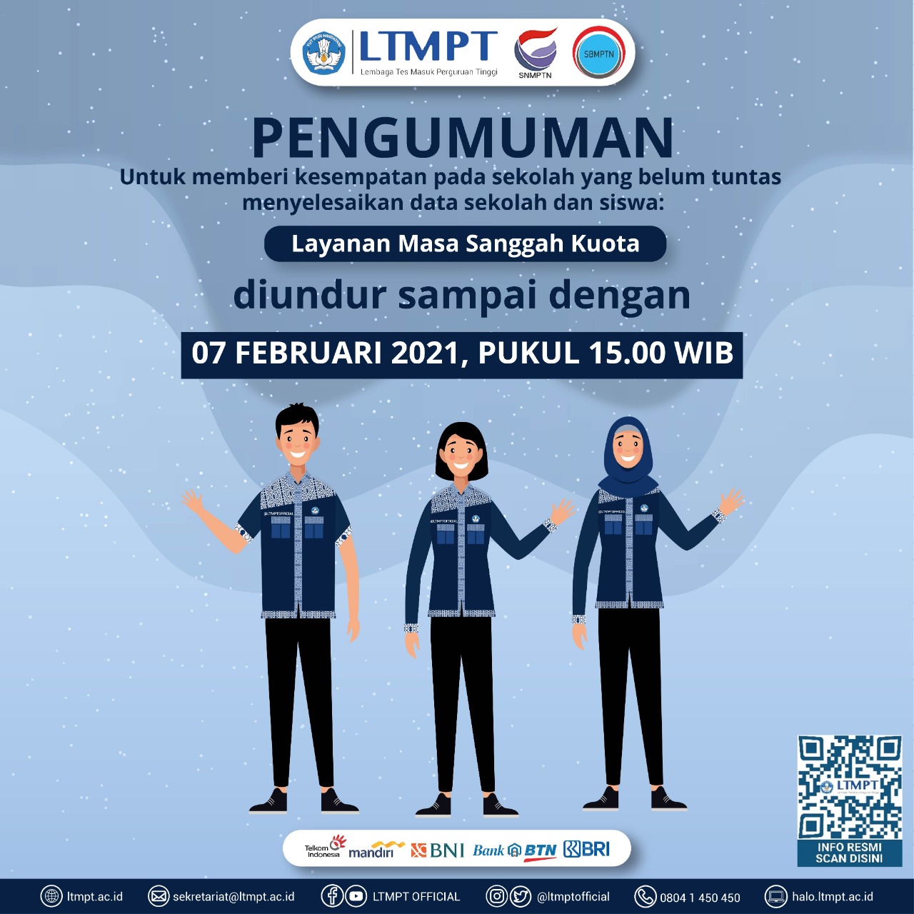 Layanan masa sanggah dan perbaikan kuota Seleksi Nasional Masuk Perguruan Tinggi Negeri (SNMPTN) 2021 diundur hingga 7 Februari 2021 pukul 15.00 WIB.