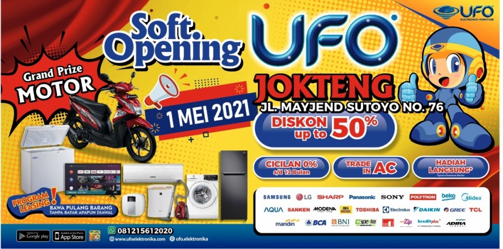 Toko elektronik UFO Elektronik akan membuka cabang baru di Pojok Benteng (Jokteng) JL. Mayjend Sutoyo No. 76 Kecamatan Mantrijeron, Kota Yogyakarta