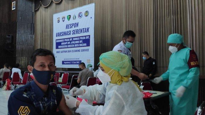 TRIBUNJOGJA.COM - Polda DIY bekerjasama dengan Asosiasi Badan Usaha Jasa Pengamanan Indonesia (ABUJAPI) DIY dan Asosiasi Perusahaan Klining Servis Indonesia (Apklindo) DIY dan UKDW menggelar vaksinasi massal.