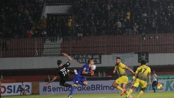 Meski Mychell Chagas sudah berupaya menendang bola sambil melayang, namun Aditya Arlan lebih cepat menyambar bola sambil berlari.