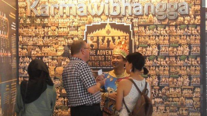 TRIBUNJOGJA.COM, YOGYA – Dua gadis Thailand itu terlihat antusias melihat deretan gambar relief dan patung tiga dimensi Karmawibhangga di selasar depan Jogja Expo Center (JEC), Sabtu (4/2/2023) petang.