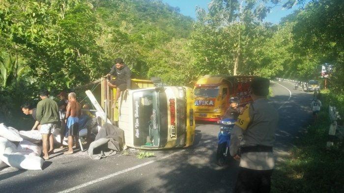 Sebuah truk terguling setelah terlibat kecelakaan lalu lintas (laka lantas) tunggal di Tanjakan Bibis, Girimulyo, Kabupaten Kulon Progo, Selasa (21/2/