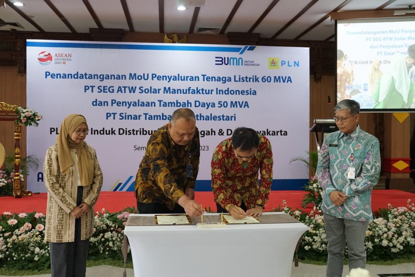 Hal ini direalisasikan dengan kembali ditandatanganinya Memorandum of Understanding (MOU) Penyaluran Tenaga Listrik 60 MVA PT. SEG ATW SOLAR Manufaktur Indonesia dan Penyalaan Tambah Daya 50 MVA PT. Sinar Tambang Arthalestari di Kantor PLN Unit Induk Distribusi Jawa Tengah dan D.I. Yogyakarta Jumat (4/8/2023) lalu.