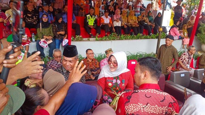Momen tersebut terjadi usai Bupati Sri Mulyani kembali ke tenda duduk VVIP setelah memberikan kata sambutan di panggung utama amphiteater Bukit Sidoguro.