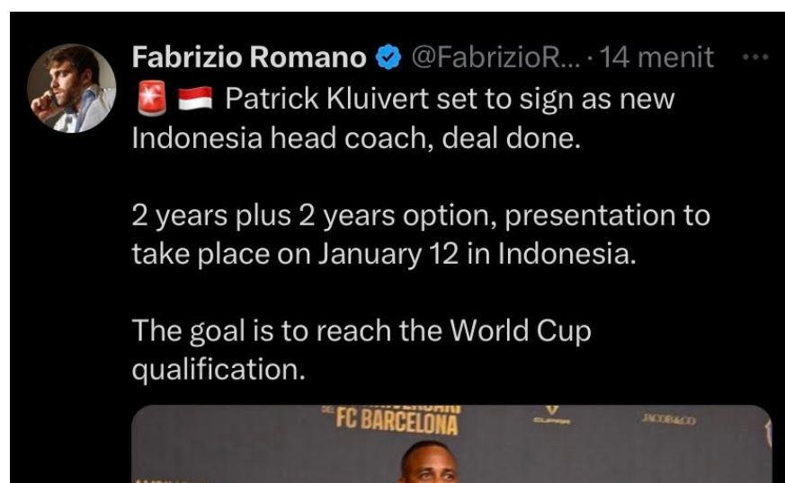 "Patrick Kluivert siap menandatangani kontrak sebagai pelatih kepala baru Indonesia, kesepakatan selesai," tulisnya melalui akun media sosial X dilihat Tribun Jogja, Senin (6/1/2025) pukul 17.30 WIB.
