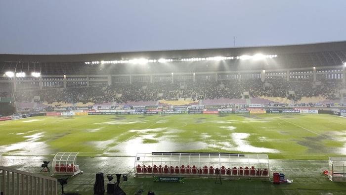 Kick Off Babak Kedua PSIM Yogyakarta vs Bhayangkara FC Ditunda 30 Menit Akibat hujan deras