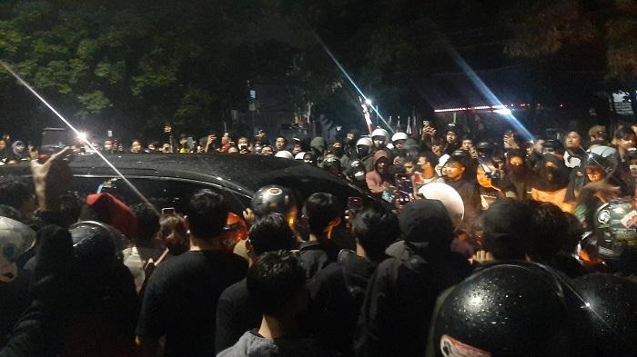 Mobil Sultan perlahan menembus massa dan para peserta aksi mengawal mobil tersebut masuk ke dalam Mapolda DIY.