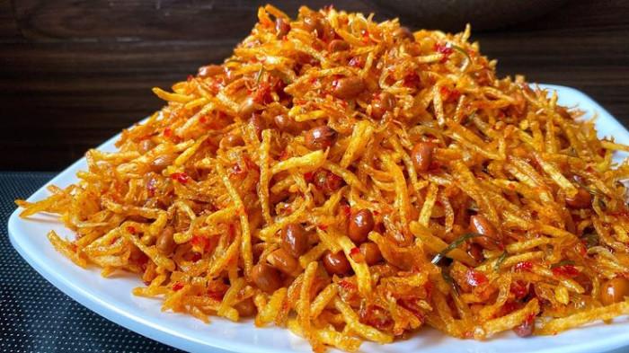 TRIBUNJOGJA.COM - Kentang mustofa merupakan olahan kentang yang diiris tipis menyerupai korek api lalu digoreng kering dengan balutan bumbu pedas manis, telah menjadi lauk kering favorit banyak keluarga Indonesia.