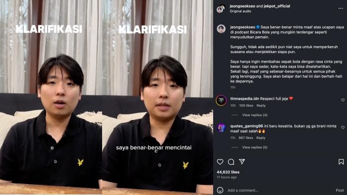 "Saya ingin menyampaikan permohonan maaf yang sebesar-besarnya atas kesalahan saya saat berbicara di podcast," ujar Jeong Seok-seo, mengakui kekeliruannya.