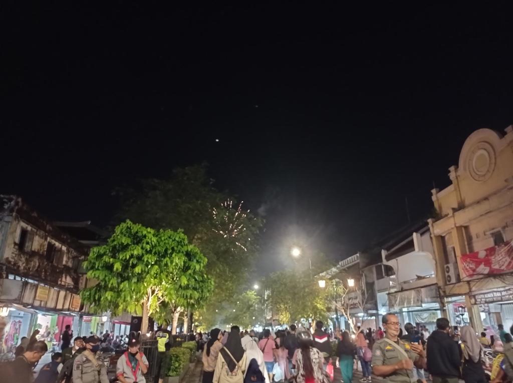 Kawasan Titik Nol Kilometer Malioboro disesaki lautan manusia saat Malam pergantian tahun, Jumat (31/12/2021).
